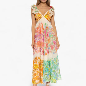 Stilvolles Maxikleid (Baumwollseide) mit Multi-Floral-Print. Gerüschte Schultern, Taillenausschnitte & selbstbindender Rücken. Perfekte Passform für diverse Anlässe.
