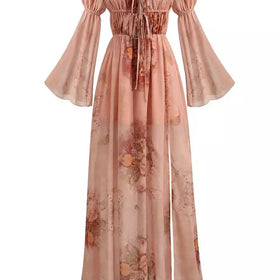 Elegantes, langes, schulterfreies Chiffonkleid mit Schlitz & langen Ärmeln