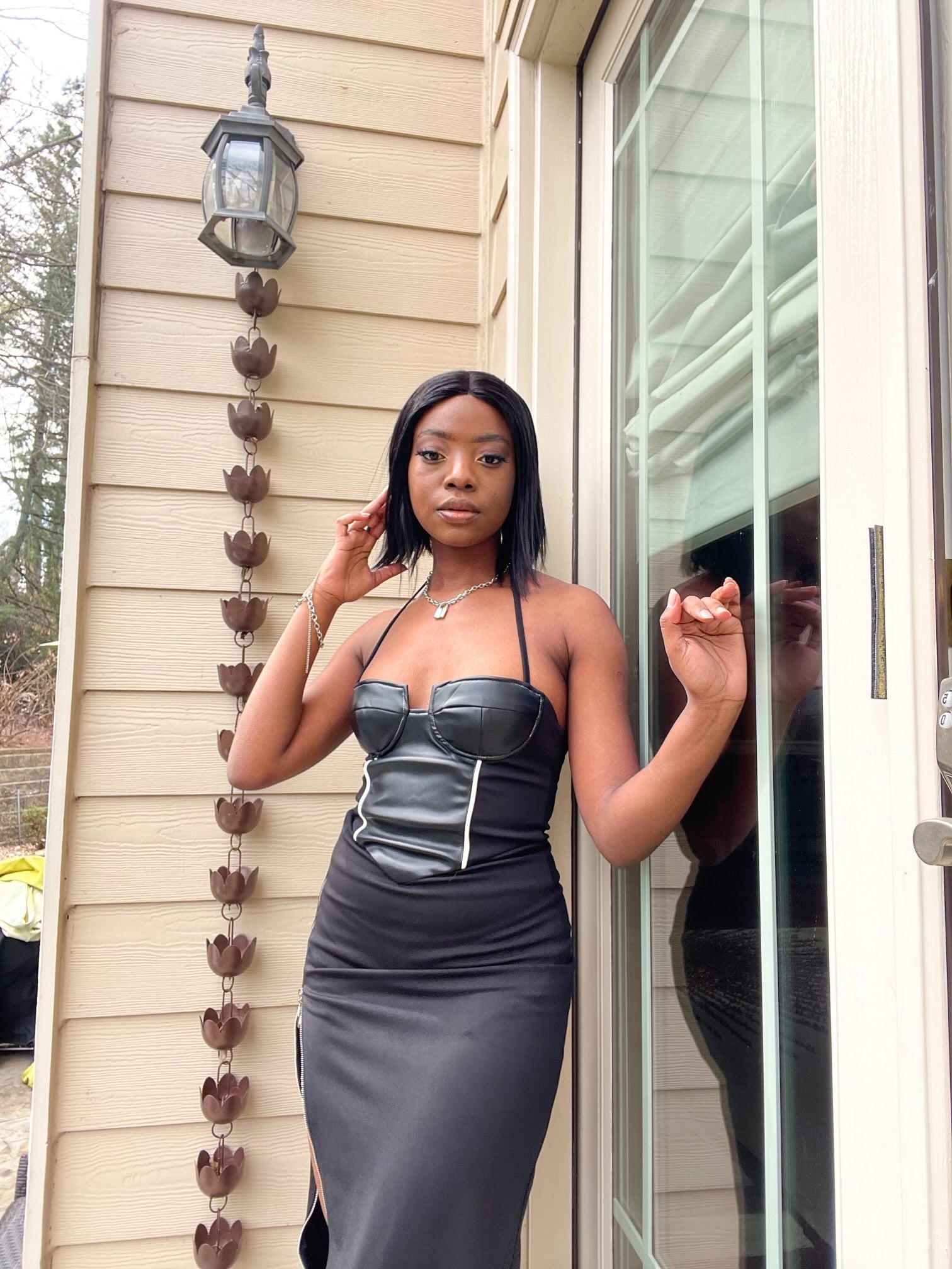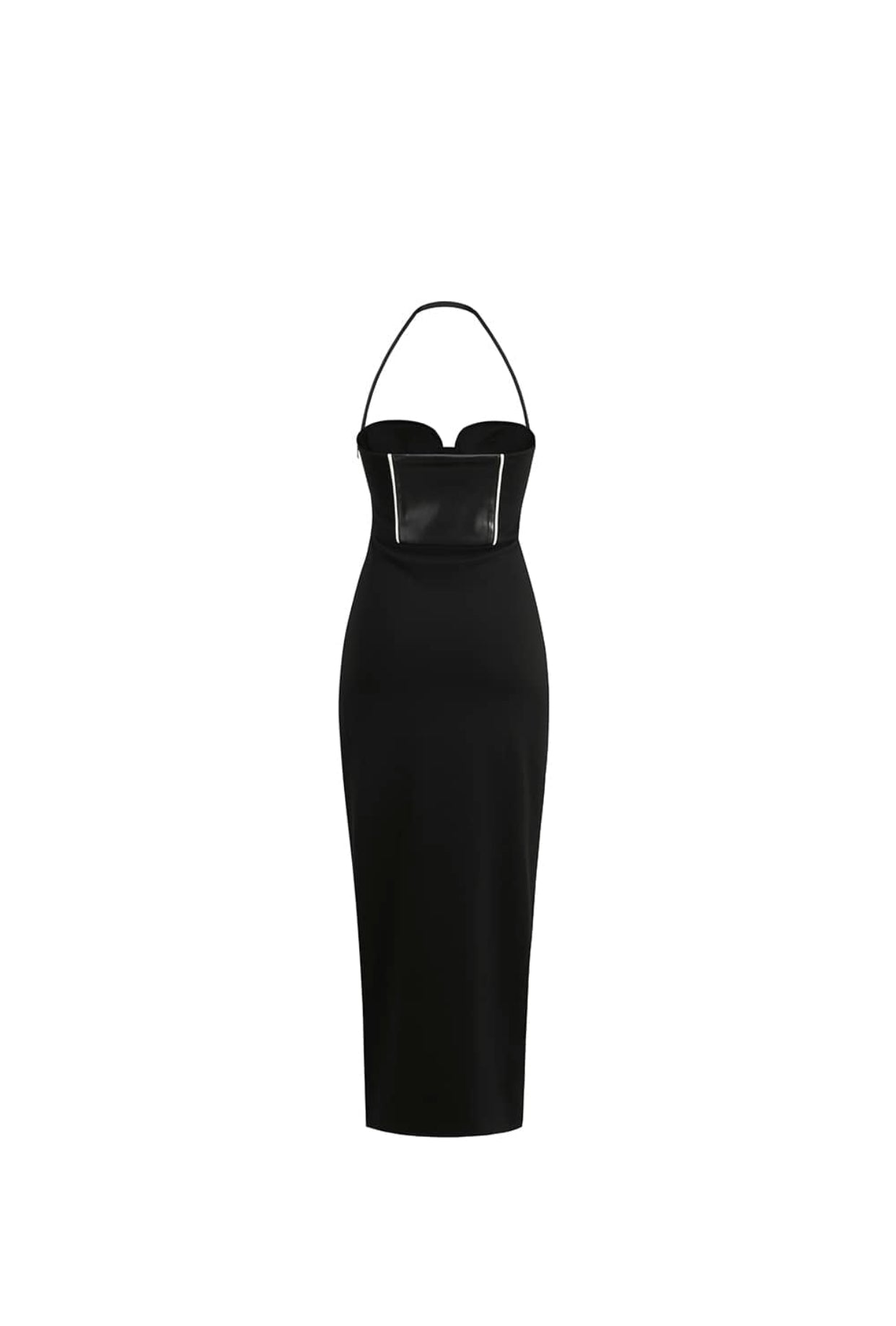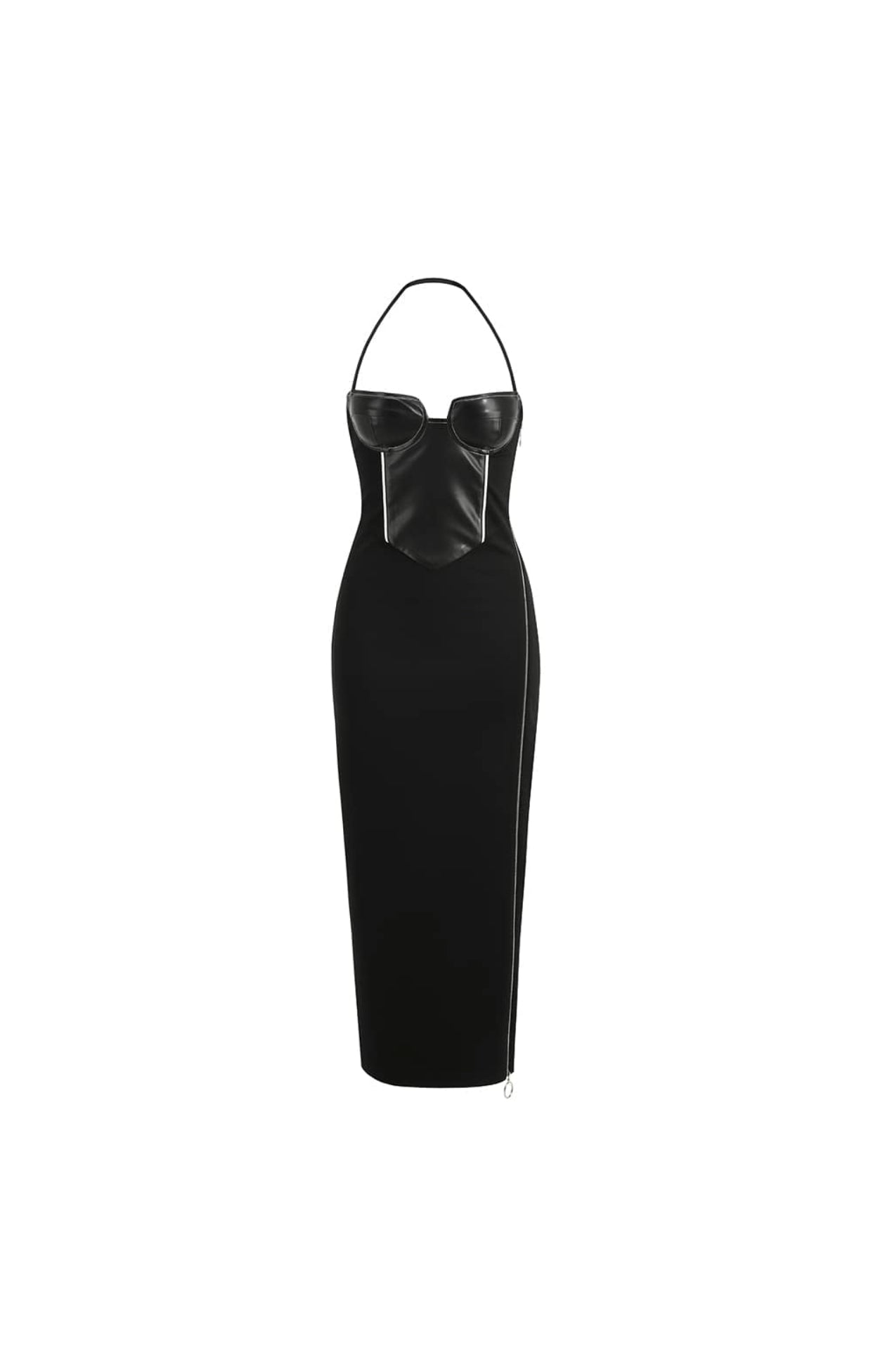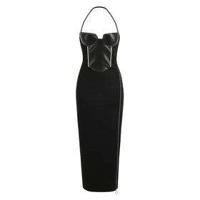Langes Neckholder-Kleid mit Leder-Oberteil und Reißverschluss