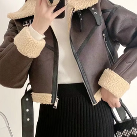 Warme winterjas van hoogwaardig imitatielam in moto-biker stijl met stijlvolle riem. Biedt dikke, behaaglijke warmte. Zachte imitatiebont voering.